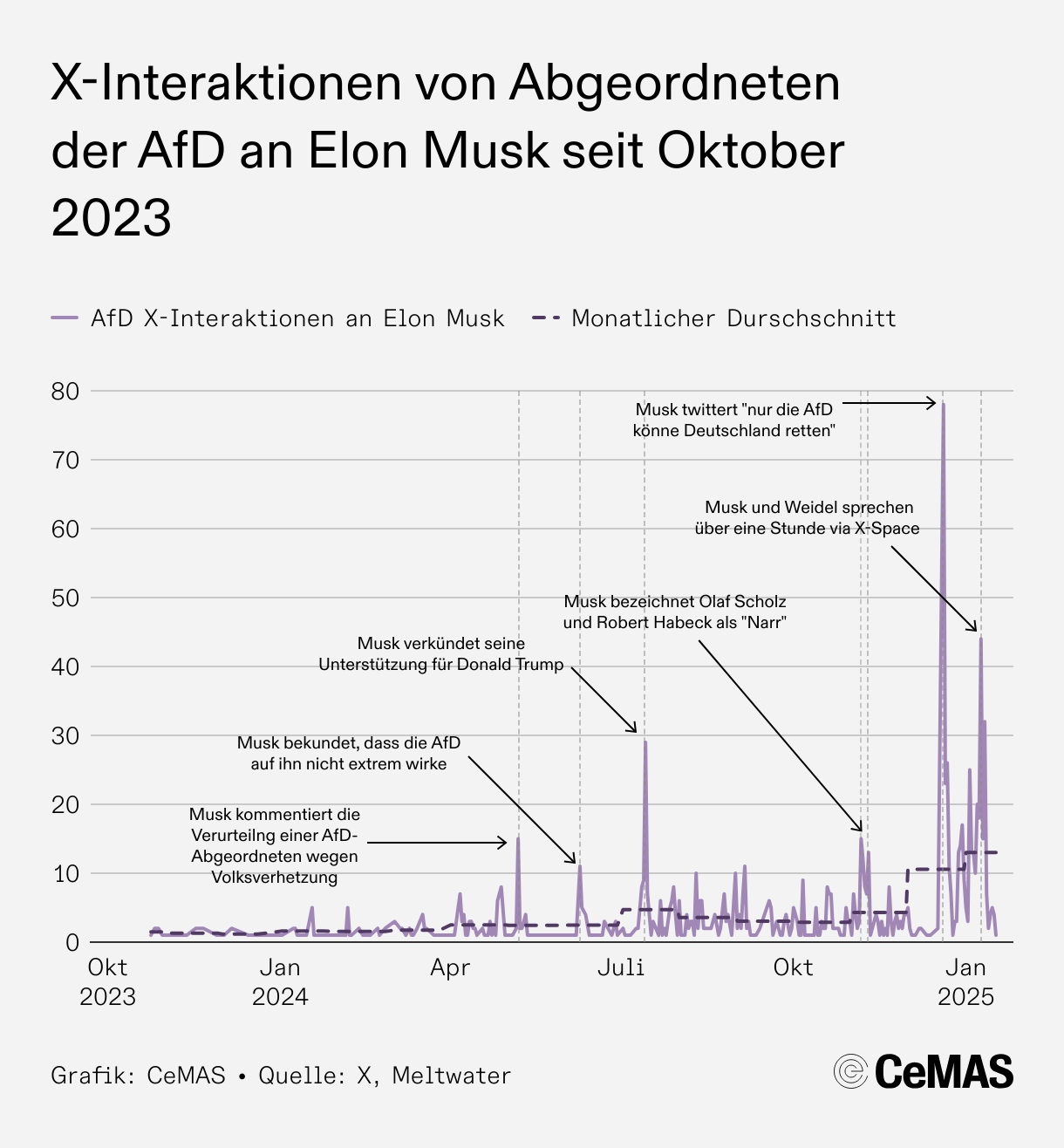 Ein erster Aufmerksamkeitspeak findet sich, nachdem Musk, als Reaktion auf den Post eines US-amerikanischen, reichweitenstarken, rechten X-Accounts, Unverständnis über die Verurteilung der AfD-Politikerin Marie-Thérèse Kaiser wegen eines rassistischen Facebook-Postings geäußert hatte. Etwa einen Monat später, am 6. Juni, äußert Musk in einer Antwort auf einen AfD unterstützenden Post zum ersten Mal explizit, dass er die Positionen der AfD nicht als extrem ansehen würde. Weitere exemplarische Momente erhöhten Interaktionsaufkommens durch AfD-Politiker:innen mit Musk zeigten sich, nachdem Musk erst den SPD-Bundeskanzler Olaf Scholz und wenige Tage später den Co-Parteivorsitzenden der Grünen, Robert Habeck, als „Narr“ bezeichnete. Solche Ereignisse gesteigerter Aufmerksamkeit auf Musk haben im Laufe des vergangenen Jahres zugenommen und finden ihren Höhepunkt vor Jahresende, nachdem Musk gepostet hatte, „nur die AfD kann Deutschland retten“. Die durchschnittliche Anzahl an Interaktionen mit Musk durch AfD-Politiker:innen findet ihren bisherigen Höhepunkt im Januar dieses Jahres, hervorgerufen durch dessen Gespräch mit Alice Weidel auf seiner Plattform X.